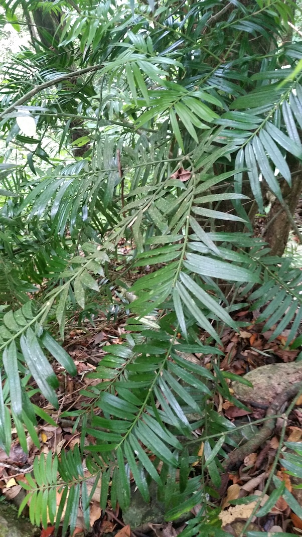 Trees to 20 m tall and 100 cm dbh with a crown of spreading or ascending branches. Bark smooth, brown, becoming scaly on large stems, exfoliating in flakes. Foliage-bearing twigs opposite, spreading at 25-60° from the shoot axis, ascending or spreading, angular in cross-section, with twisted grooves running from one leaf base to the next; green in the first year, turning yellowish brown in following years; terminal foliar bud ovoid with with ovate-triangular, acute, keeled scales. Leaves spreading distichously at 50-70° from shoot axis, elliptical, oblanceolate or linear, (3-)5-8(-9) cm long, (4.3-)5-8.5 mm wide, straight to falcate, short petiolate, narrowing at base, tapering to a long acute or obtuse apex, dark green, with two abaxial (lower) white or cream-colored stomatal bands bordered by green leaf margins and a midrib on the lower surface; margins revolute. Leaf texture coriaceous, with sclereids causing a mottled, rugose upper surface. Midrib prominently raised on the adaxial (upper) side, lying in a shallow groove 0.5 mm wide, continuous to apex, raised near base and 1-1.8 mm wide on the abaxial side. Pollen cone racemes depend from large axillary or subterminal buds with 3-4 racemes together, rarely solitary, 2.5-4.5 cm long, each with 8-12 cone pairs when full-grown, cones subglobose or ovoid, 3-4 mm long; microsporophylls 8-11, peltate, each with (3-)4-6-8) pollen sacs. Seed-bearing structures near ends of foliage shoots, axillary, solitary on a slender, downcurved, 1-2 cm long peduncle, with ca. 8 decussate, keeled bracts enclosing a single, terminal ovule; only known in immature stage (Farjon 2010).